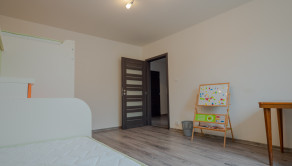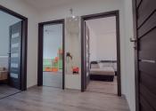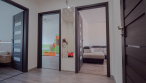 Priestranná vstupná chodba s WC, kúpeľňou, spálňa, izba, z obývačky vchod do kuchyne.