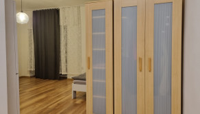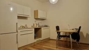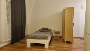 Garsonka disponuje veľkou izbou, v ktorej je kuchyňa, jedálenský stôl so stoličkami, posteľ a skrine. Kúpeľňa je spojená s WC.